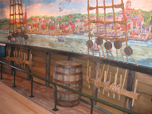 Working closely with the museum, Traub Design Associates was able to overcome several design challenges. Because of the limited space it was necessary to quickly set the exhibit's tone, prepare the visitor for his/her exhibit experience, and immerse the visitor in an earlier historical context. Prior to entering the gallery, the visitor is asked to assume the role of a captured African headed for the sale block of the Annapolis slave market. He/she is aboard a replica of an 18th century frigate overlooking the harbor. To complete the transition into the museum experience, the visitor moves into a state-of-the-art theater for a short introductory film. Through the inventive use of replicas, graphics, historical images and multimedia, the challenge of telling compelling stories with a minimum of artifacts was successfully overcome. This premier exhibition will provide the museum with years of service, durability and a variety of interpretative opportunities.